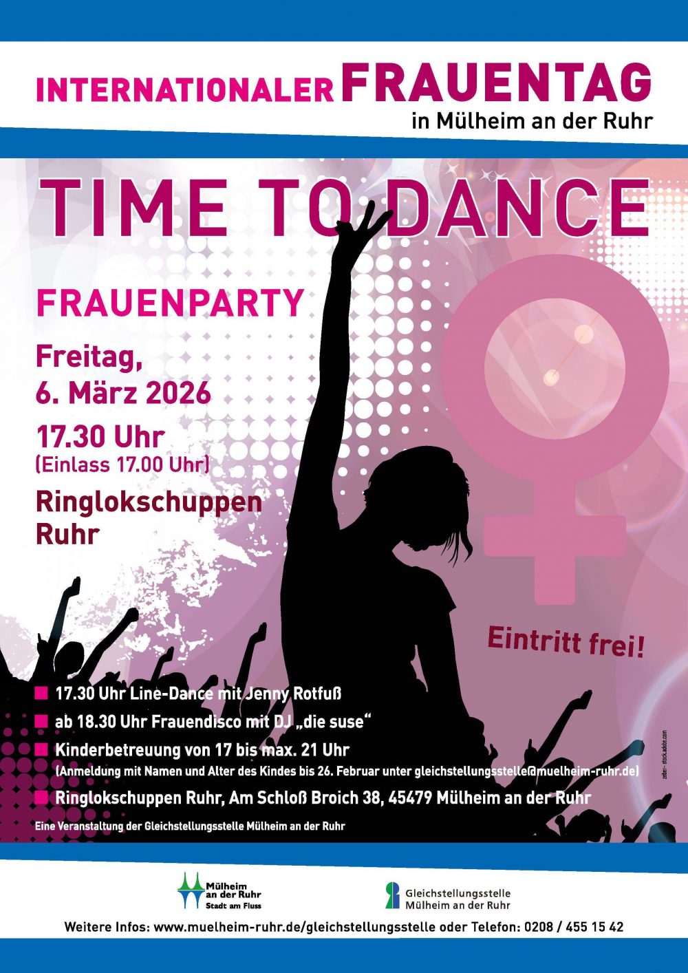 Unter dem Motto: Time to Dance veranstaltet die Gleichstellungsstelle Mülheim an der Ruhr am Freitag, 6. März 2026, wieder eine Frauenparty im Ringlokschuppen Ruhr, Am Schloß Broich 38. Nach dem „warm up“ um 17.30 Uhr (Einlass ab 17 Uhr), einem Line-Dance Kurs mit der Tanzlehrerin Jenny Rotfuß, geht es gegen 18.30 Uhr mit fetziger Musik von DJ diesuse weiter. Den ganzen Abend darf gefeiert und quer durch alle Stile getanzt werden. Für Gespräche und den Austausch am Rande gibt es gemütliche Sitzecken und das Team des Ringlokschuppens sorgt für kalte Getränke.